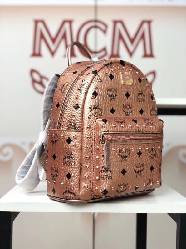 MCM官网 Stark经典双肩包迷你号 采用涂层帆布精心制作 侧边点缀细致铆钉 香槟金