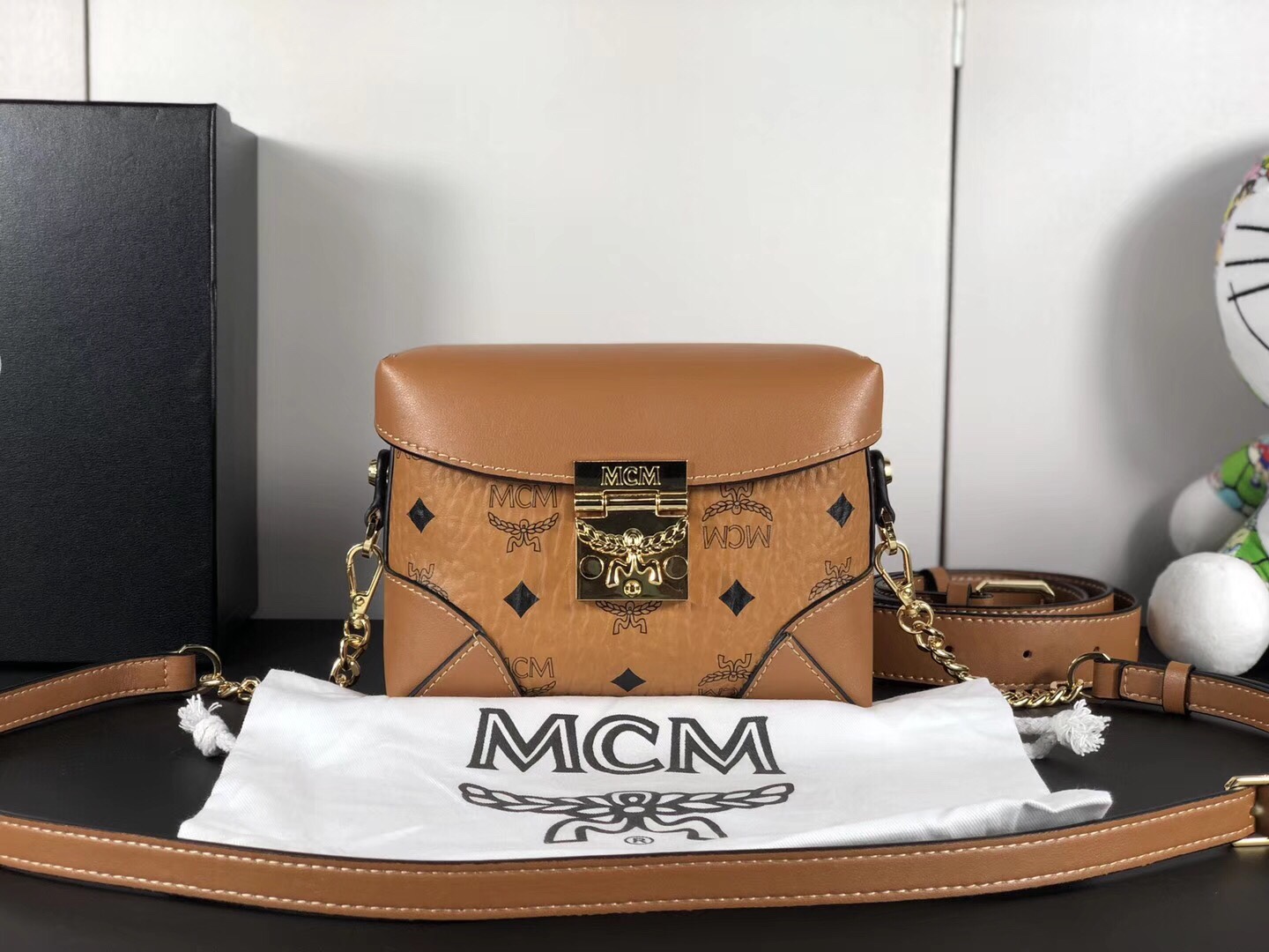 MCM官网 2018经典印花复古小方盒 定制专用皮配原版牛皮 可斜跨单肩 土黄