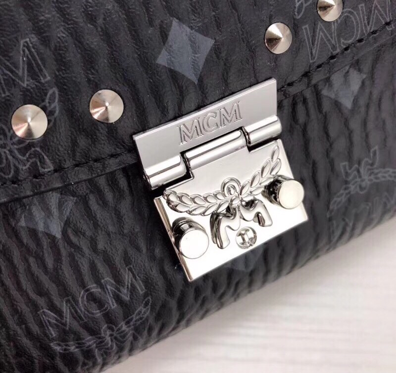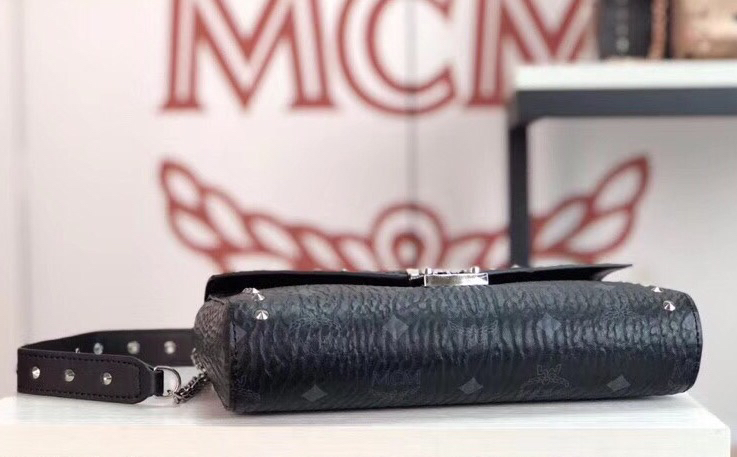 MCM MILLIE VISETOS铆钉斜挎包(黑色)采用经典印花涂层帆布制成 镶上铆钉的折叠顶部翻盖设计 既可单肩背/斜挎