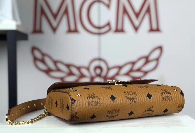 MCM MILLIE VISETOS铆钉斜挎包(土黄)采用经典印花涂层帆布制成 镶上铆钉的折叠顶部翻盖设计 既可单肩背/斜挎