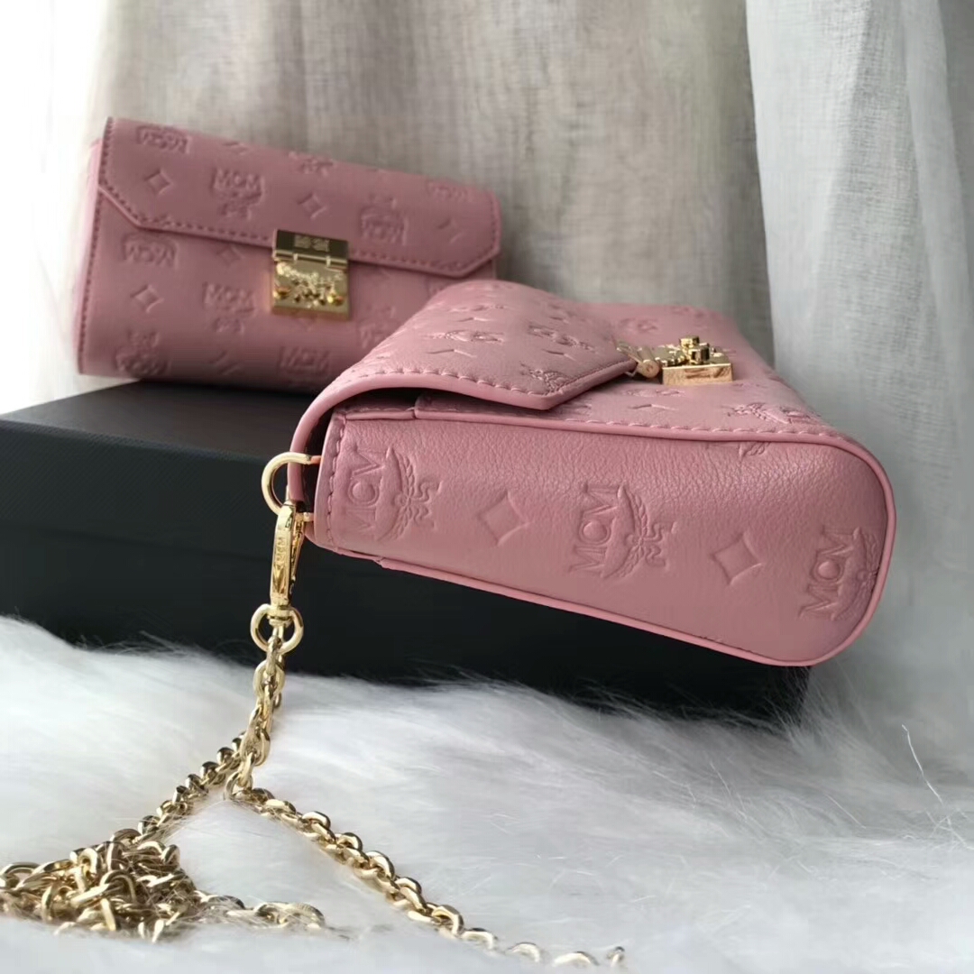 MCM Millie 19款 压花链条包(冰激凌粉)采用独特的粒面字母组合图案,上等的头层牛皮,带着淡淡的清香,是真正的时尚宠儿,标志性月桂叶包锁闭合设计更是为其锦上添花