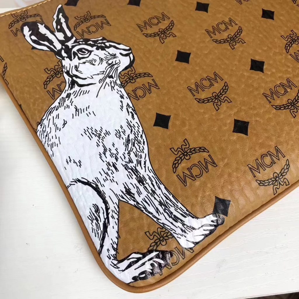 MCM 秋冬新款 Rabbit捉迷藏兔子 手拿包/腕包 (土黄)时尚百搭拉链款 简约方形设计 LOGO印花为底 可爱兔子图案印花