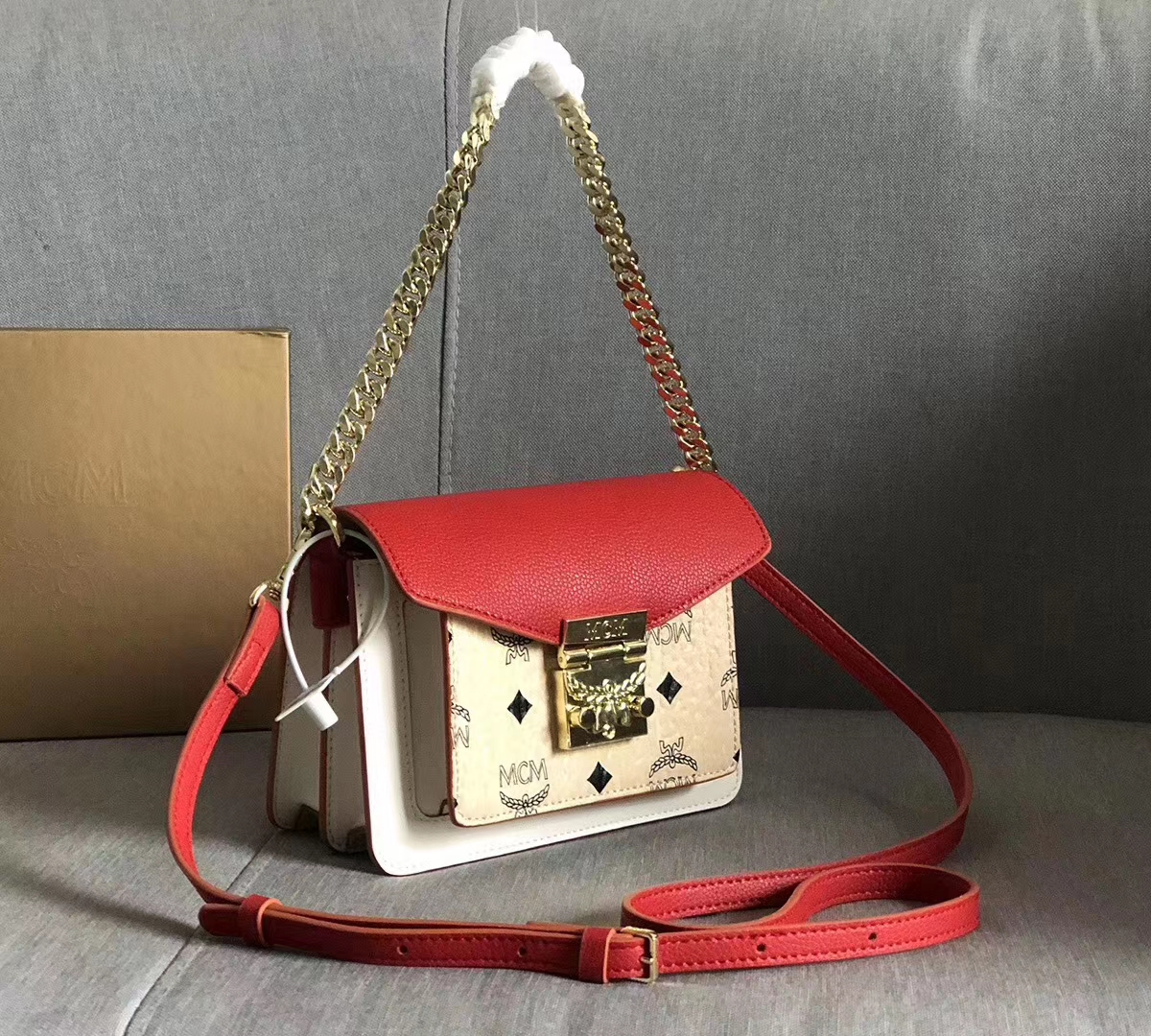 MCM 2019 春夏PATRICIA mini 拼接风琴包(大红/米白) 这款Patricia斜挎包采用我们传奇性的Visetos印花涂层帆布与色块皮革组合,给人焕然一新的感觉。多个隔层、正面翻盖月桂叶锁扣闭合、优雅的金色调五金件以及可拆卸背带,打造全新经典之作