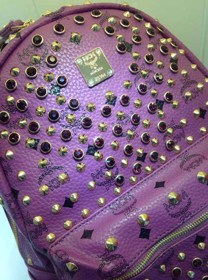 品牌:MCM;等级:原版皮;附件:身份卡,防尘袋;颜色:紫色、红色、荧光粉、黑色、土黄色、白色;中号28*32*14cm, 小号24*30*14cm ;用途:双肩包