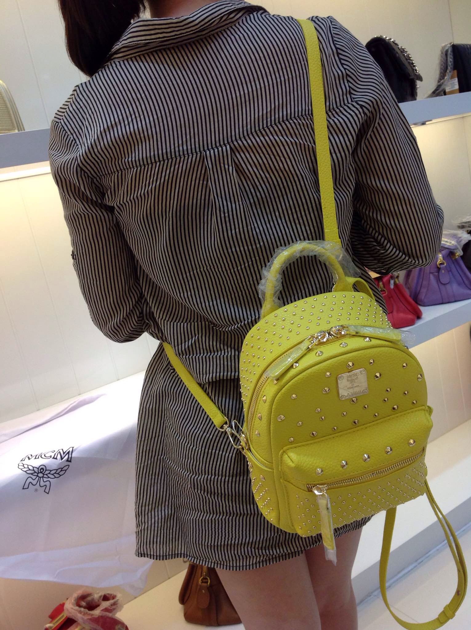 品牌:MCM;等级:原版皮;附件:身份卡,防尘袋;颜色:柠檬黄;小mini22*28*11cm ;用途:双肩包、斜挎包