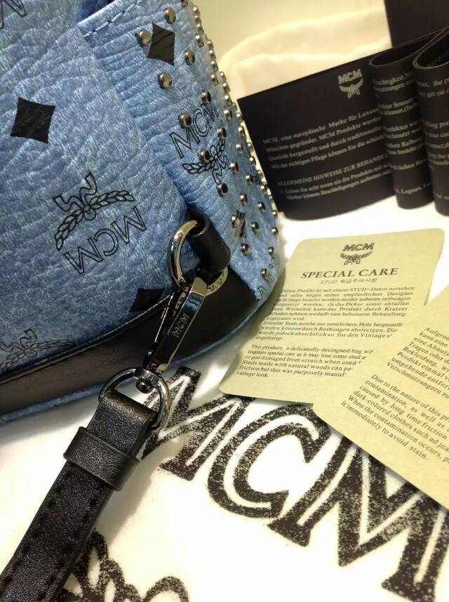 MCM双肩包批发市场 满钉水洗蓝女士背包 MCM官网同步