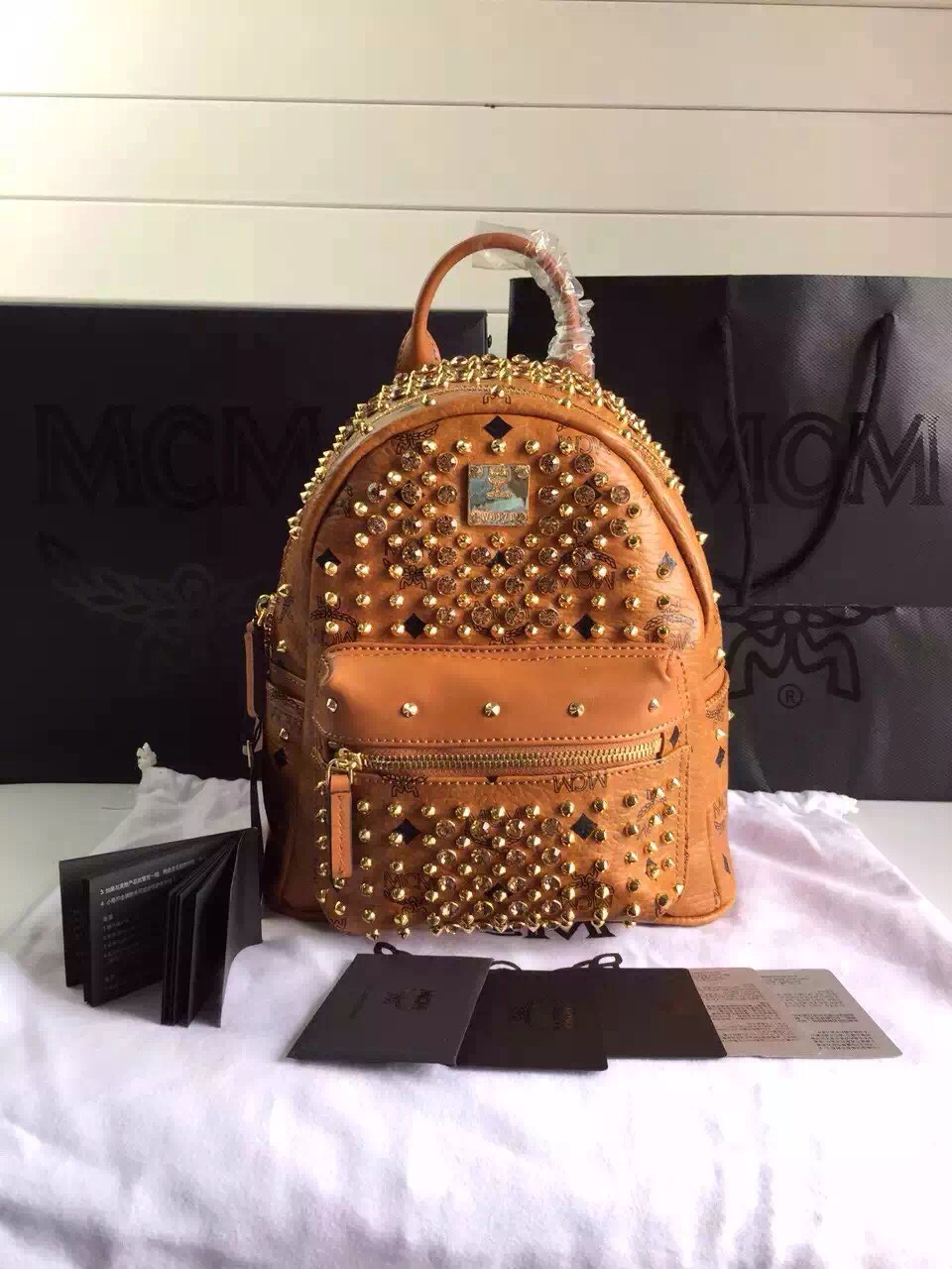 MCM原单 限量版双肩包 纯手工铆钉配水钻 专柜全包装 土黄