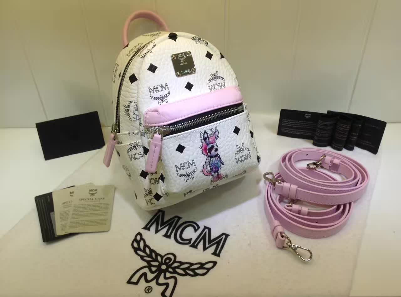 MCM韩国官网 超mini兔子背包 全新皮质纹理 内搭厚实耐用帆布 白拼粉
