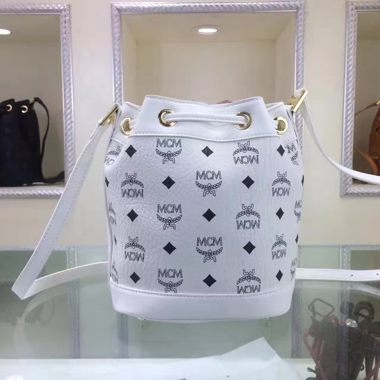 MCM2017新款 迷你单肩斜跨包水桶包 轻巧有型 时尚简约的抽绳设计 白色