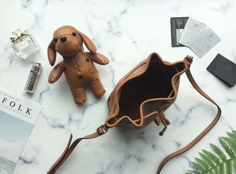 MCM韩国官网 小狗狗摆件水桶抽绳包 Visetos印花 小狗摆件可拆卸 土黄