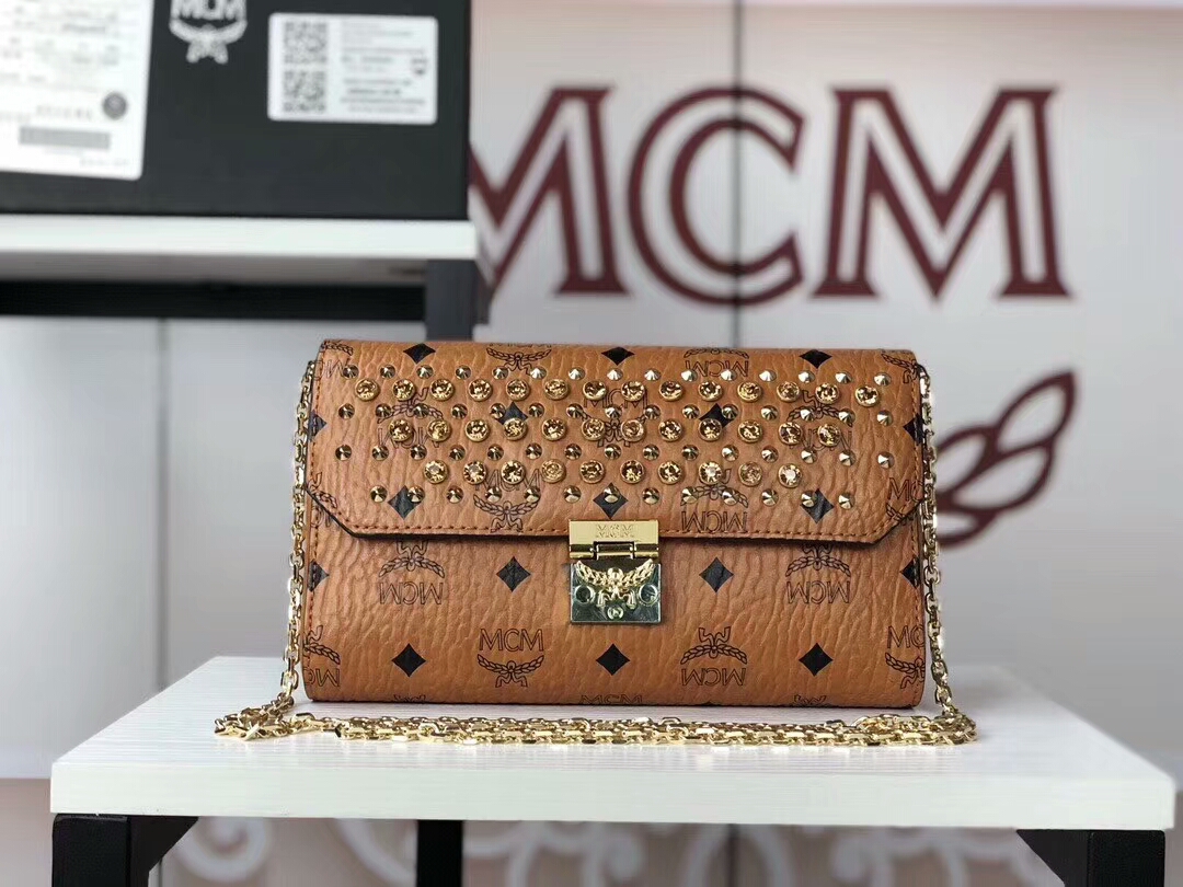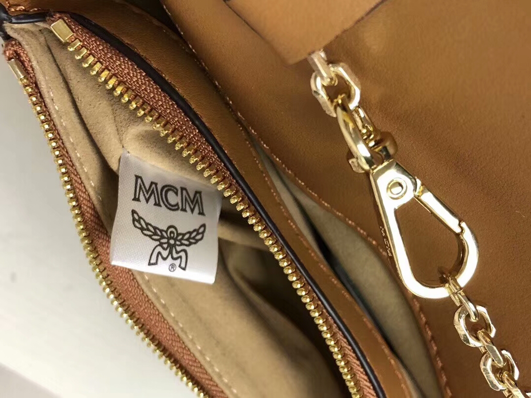 MCM官网 Mille 铆钉水钻翻盖链条包 ykk拉链 折叠翻盖月桂叶按扣 土黄