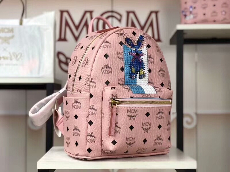 MCM韩国官网 2018春夏新款 珠钻彩虹兔子双肩包 重工钉珠工艺 可爱兔子图案 冰激凌粉