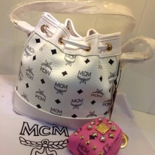 广州白云皮具城 MCM白色真皮单肩包 柳钉真皮抽绳 mini水桶包