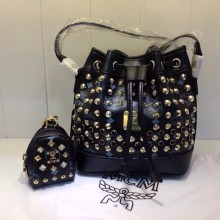 一手货源 MCM黑色水桶包 Mini单肩包 真皮抽绳