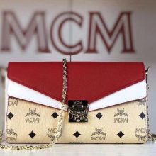 MCM Mille系列双皮盖链条包 翻盖设计 经典Visetos图案材质组合及色块皮革 米白拼大红