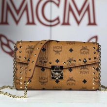 MCM MILLIE VISETOS铆钉斜挎包 采用经典印花涂层帆布制成 镶上铆钉的折叠顶部翻盖设计 土黄