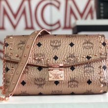 MCM MILLIE VISETOS铆钉斜挎包 采用经典印花涂层帆布制成 镶上铆钉的折叠顶部翻盖设计 香槟金