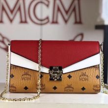 MCM Mille系列双皮盖链条包 翻盖设计 经典Visetos图案材质组合及色块皮革 土黄拼大红