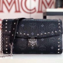 MCM MILLIE VISETOS铆钉斜挎包 采用经典印花涂层帆布制成 镶上铆钉的折叠顶部翻盖设计 黑色