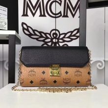 MCM新款 Visetos Patricia手袋斜跨链条包 粗纹进口PVC配原版牛皮 土黄拼黑皮