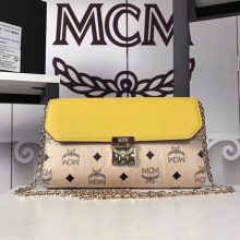 MCM新款 Visetos Patricia手袋斜跨链条包 粗纹进口PVC配原版牛皮 米白拼柠檬黄