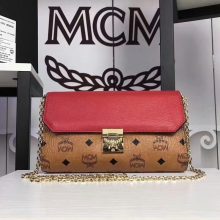 MCM新款 Visetos Patricia手袋斜跨链条包 粗纹进口PVC配原版牛皮 土黄拼红皮