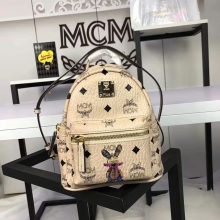 MCM韩国官网 2018春夏新款 珠钻彩虹兔子双肩包 重工钉珠工艺 可爱兔子图案 米白