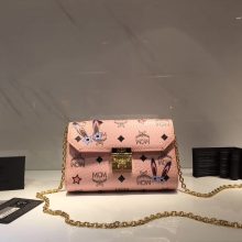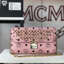 MCM官网 Mille 铆钉水钻翻盖链条包 ykk拉链 折叠翻盖月桂叶按扣 冰激凌粉