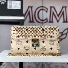 MCM官网 Mille 铆钉水钻翻盖链条包 ykk拉链 折叠翻盖月桂叶按扣 米白