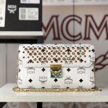 MCM官网 Mille 铆钉水钻翻盖链条包 ykk拉链 折叠翻盖月桂叶按扣 白色